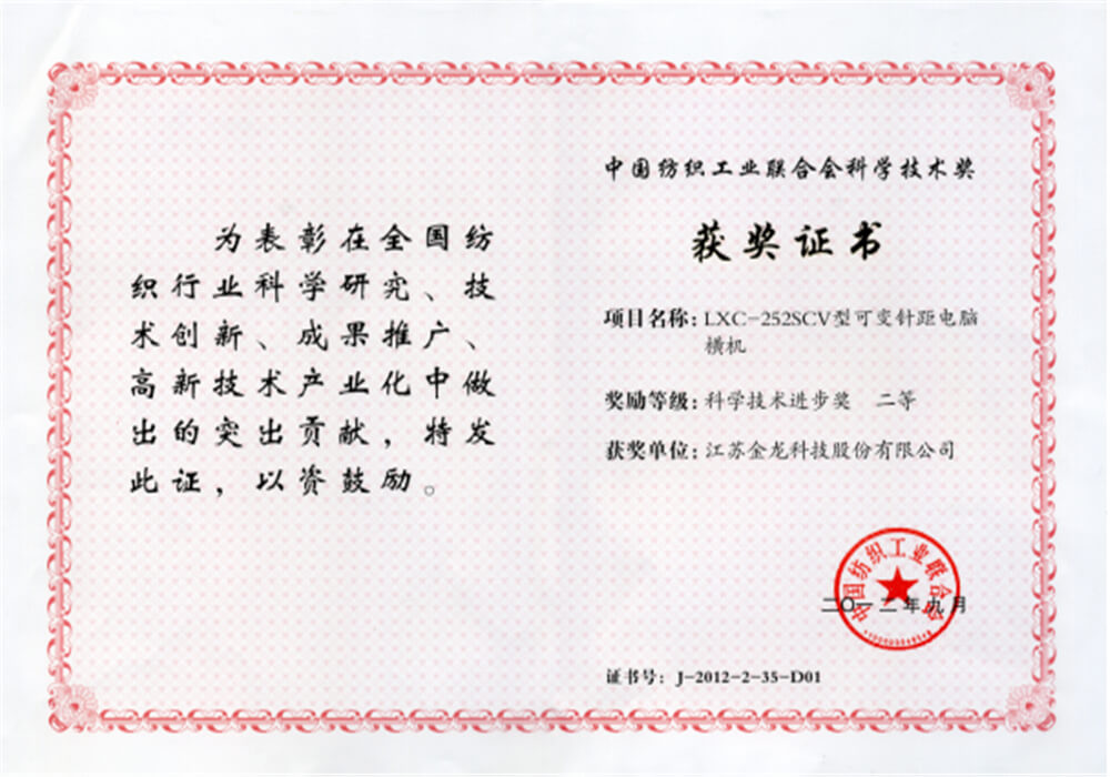 Certificate of Science and Technology Award of China Textile Industry Federation
