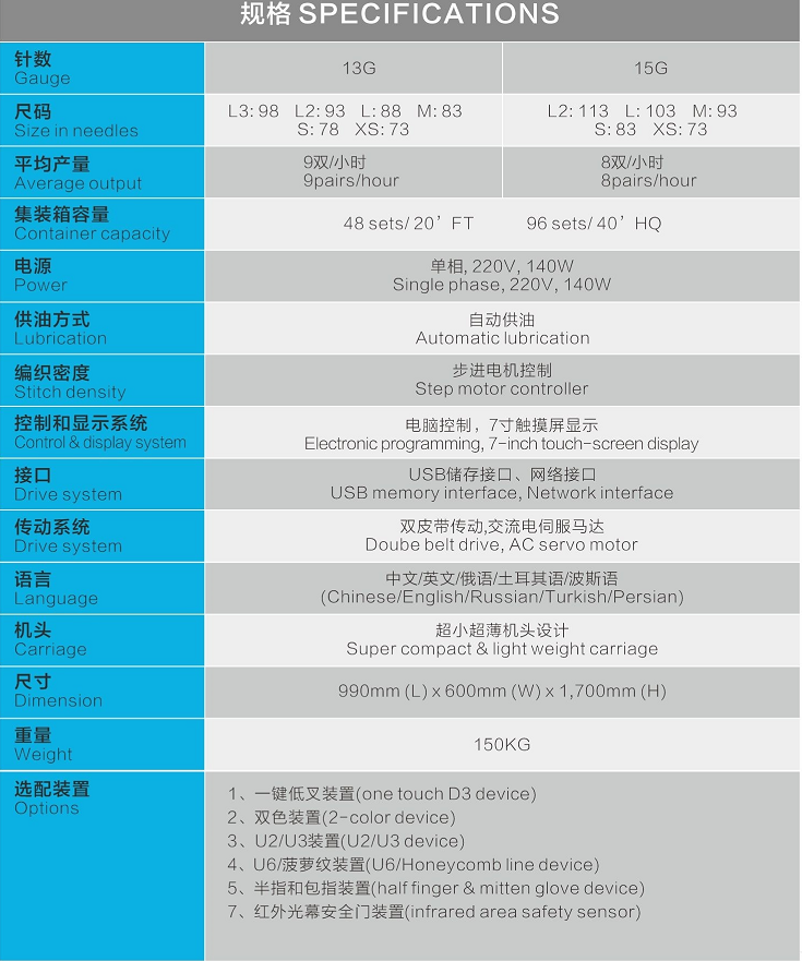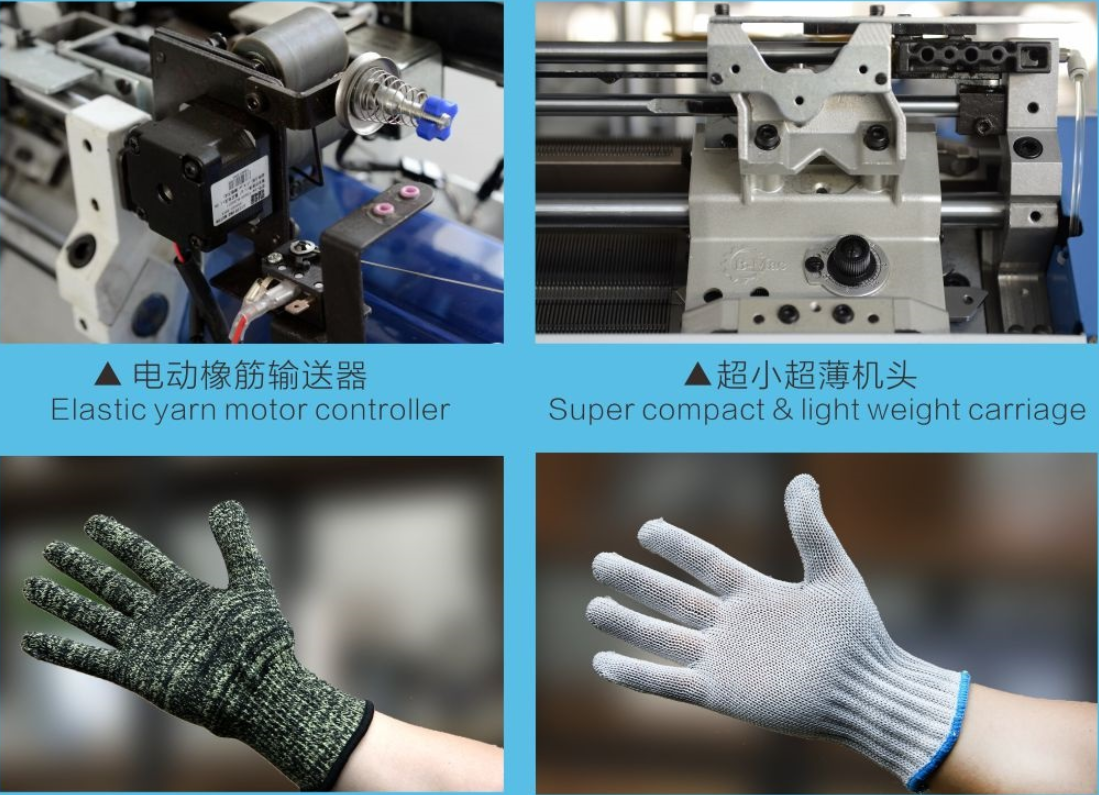 7.2-color &3-color devices: it can make gloves with 2 or 3 colors stripes. By using conductive yarn at the fingers. the gloves can be used for touch-screen products.